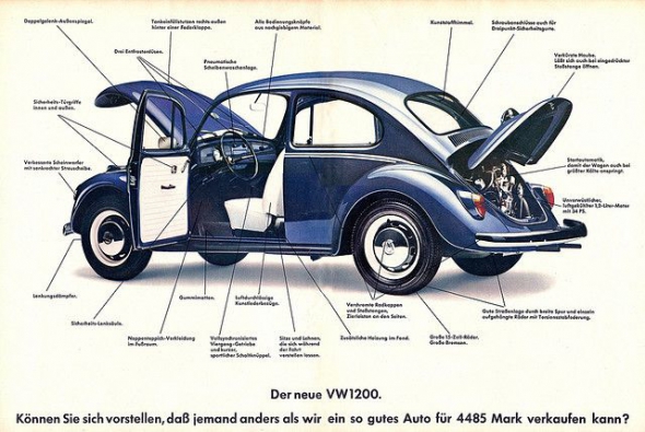 В цьому авто двигун розташували ззаду. Вся конструція максимально спрощена, щоб собівартість була низькою. Авто створити для Німеччини за наказом Адольфа Гітлера. Основна вимога диктатора — доступність для народу. Kafer почали виготовляти 1938 року. Всього виготовили 23,5 млн автомобілів.