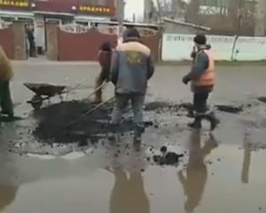 Користувачів мережі вразило відео, як працівники дорожніх служб міста Здолбунова Рівненської області засипають ями на дорозі асфальтом після дощу.