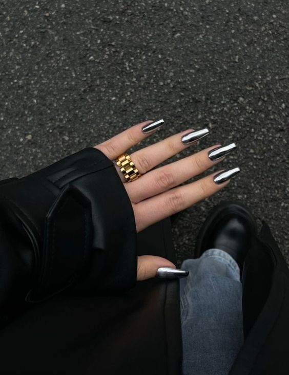 Один з трендів цього року. Щоб створити блискучий і ефектний дизайн попросіть майстра покрити ваші нігті металевим відтінком лаку або спеціальною фольгою.