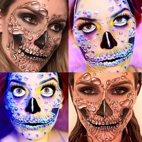 Візажист з Лондону Ванесса Девіс шокувала соціальні мережі талантом. Вона розмальовує своє обличчя черепами. Малюнки виконані з неабиякою точністю. До образів автор додає декор — кристали Swarovski.