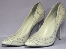 Показує на полиці білі туфлі з брошкою на носку і бантиком на п'яті. Поряд стоять круглоносі, обшиті паєтками та бісером.