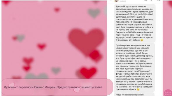 Блогерка поділилася, що чоловік її шантажує. Він грозився розкрити правду про неї, якщо вона не підпише документи й не прийме його умови розлучення. Пустовіт оприлюднила листування з Ігорем, у якому він вимагає, щоб двоє синів жили з ним. Також він хоче забрати будинок і автомобіль.