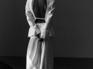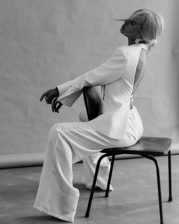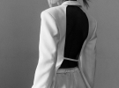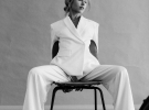Одягла білий костюм, який складається з штанів вільного крою і жакета з відкритою спиною.
