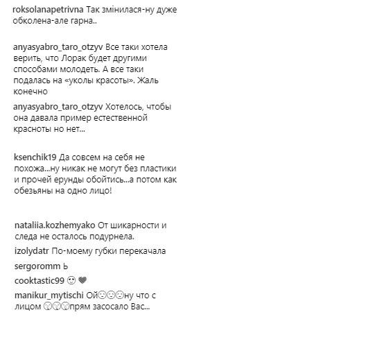 "Щось хірурги "накосячили" з обличчям цього разу", "Жахливе фото", "Все таки хотіла вірити, що Лорак буде іншими способами молодіти. А все-таки подалася на "уколи краси". Шкода звичайно", "Навіщо себе спотворювати", - написали користувачі. Незважаючи на негативні дописи, світлина набрала майже 90 тис. вподобань.