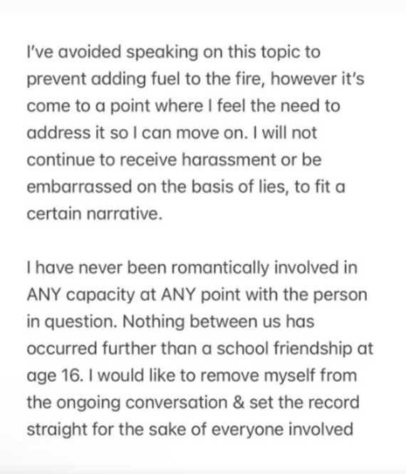 "Я уникала розмов на цю тему, щоб не підливати олії у вогонь, проте настав момент, коли я відчуваю потребу прокоментувати це питання, щоб рухатися далі. Я не буду продовжувати терпіти переслідування чи соромитися брехні, яка відповідає якійсь історії. Я ніколи не мала романтичних стосунків у будь-якому статусі з цією особою (Брукліном - Gazeta.ua). Між нами не було нічого, окрім шкільної дружби у 16 років. Я хотіла б вийти з цієї розмови та прояснити ситуацію заради всіх причетних", - написала блогерка.