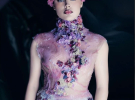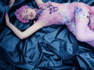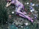 Перед камерами модель постала в фіолетовій сукні з нашитими пелюстками. Образ доповнила квітковою перукою і яскравим макіяжем.