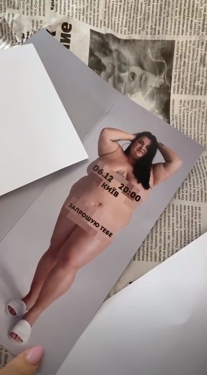 На одному з них зірка в чорному купальнику, а на другому - повністю оголена. Інтимні місця прикриті написами з датою і місцем концерту і словами "запрошую тебе".