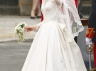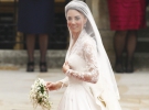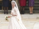 Кейт Міддлтон з'явилася перед вівтарем у білій весільній сукні з довгими мереживними рукавами, яку для неї пошили у модному домі Александра МакКвіна. За дизайн сукні відповідала нинішня голова дому Сара Бартон. Шовкова сукня нареченої прикрашена мереживними квітами-символами різних частин Сполученого Королівства. На голові у Кейт тіара від Cartier королеви Єлизавети II, подарована їй батьками на 18-річчя.