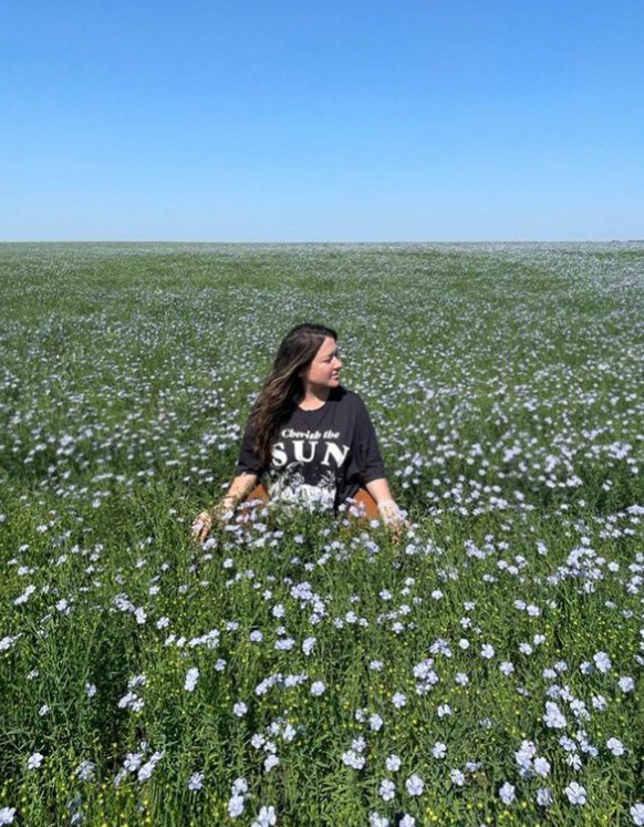 "Деокуповані території. Лінія фронту. Війна. Навіть повірити неможливо, коли бачиш це затишне поле льону, з прекрасної культури якої роблять їжу, одяг, ліки. Дивишся – і у голові не вкладається, який жах коїться в декількох кілометрах звідси… Люблю тебе, моя Україно. Бажаю всім нам щастя, бажаю всім нам перемоги", – написала.
