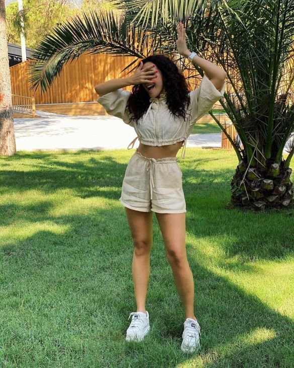 На іншому знімка зірка зображена у бежевому кроптопі, мінішортах та білих кросівках. Зірка здивовано відкрила рота та однією рукою закрила очі.