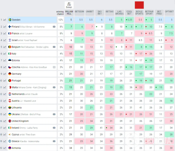Букмекери пророкують гурту Ziferblat лише 2%, пишуть на сайті Eurovision world.