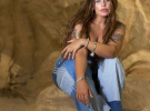 Зірка позувала на білосніжному камінні та піску. Одягла джинсовий топ і широкі штани.