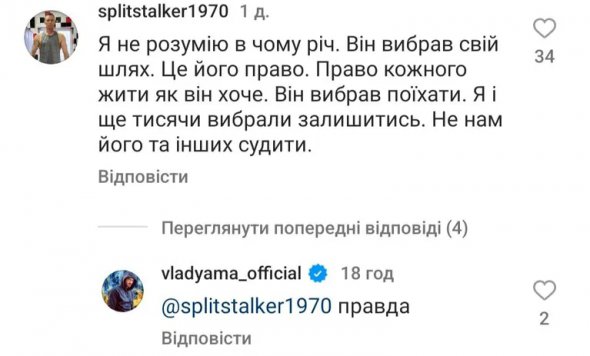 "Я не розумію у чому річ. Він вибрав свій шлях. Це його право. Право кожного жити, як він хоче. Він вибрав поїхати. Я і ще тисячі вибрали залишитись. Не нам його судити", – писали прихильники.