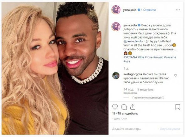 На сторінці в Instagram Соломко розмістила спільне фото з американським співаком Джейсоном Деруло. Виконавиця назвала чоловіка другом та привітала з днем народження.