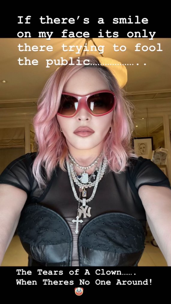 "Якщо на моєму обличчі є усмішка, це лише спроба обдурити публіку. Сльози клоуна...коли нікого немає навкруги", – неоднозначно підписала кадр Мадонна.