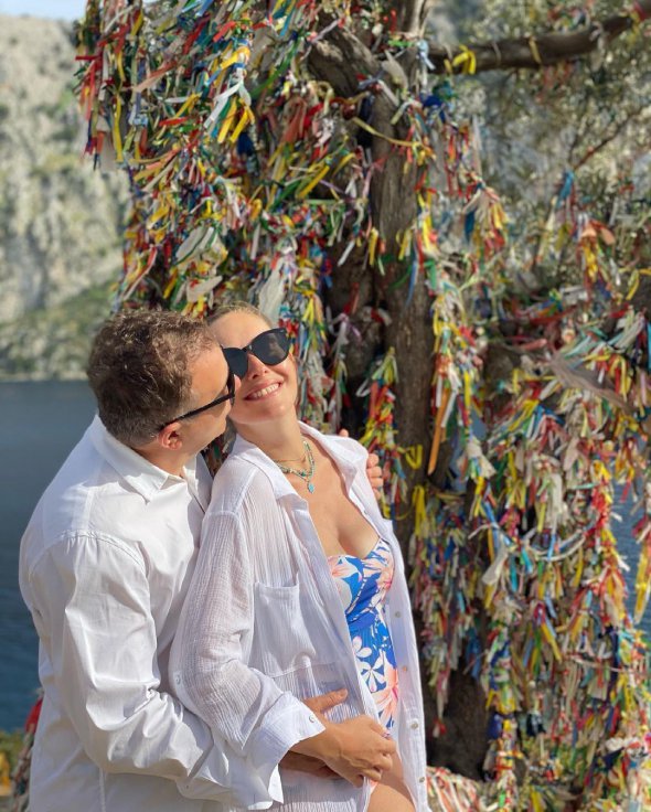 Так, пара, яка святкує Великдень в Туреччині, наробила романтичних світлин під час відпочинку. Одним з фото ведучий поділився в Instagram. На знімку знаменитість ніжно обіймає та цілує майбутню матусю, яка позує в синьому суцільному купальнику з рожевими квітами. Осадча засвітила чималий животик.