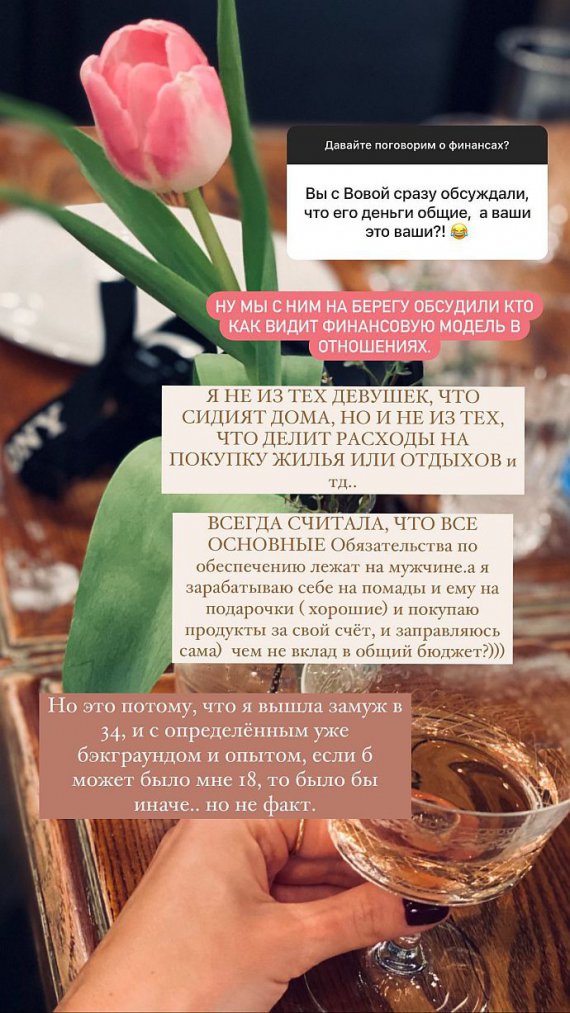 "Завжди вважала, що основні обов'язки щодо забезпечення має взяти на себе чоловік. А я заробляю собі на помади і йому на гарні подарунки. Також купую продукти і заправляю машину сама. Чим не вклад у загальний бюджет? Утримувати чоловіка - це зовсім не моє. Але комусь же так підходить, хтось і квартиру знімає 50 на 50, кожному своє. Я не засуджую", - зазначила вона.