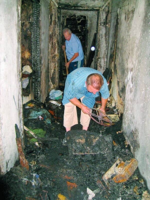 У під'їзді чути сильний запах горілого. На стінах сліди від води. На п'ятому поверсі і вище стеля чорна від сажі. Біля горілої квартири лежать одвірки. У коридорі і кімнатах повно сажі, вперемішку із залишками речей і меблів. 64-річний Володимир Савчук і 57-річний Григорій Шкляр розгрібають лопатами прохід.