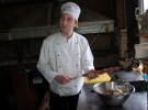 Для трьох порцій ріже великими шматками 300 грамів баранини, далі готує маринад. Вичавлює у миску сік половини лимона, засипає пів чайної ложки готової приправи для шашлику. Додає чорний мелений перець на кінчику ножа, ріже дрібними кубиками середню цибулину, засипає у миску. Кладе у суміш м'ясо, усе добре перемішує руками і накриває фольгою. Ставить на годину в холодильник. Пояснює, цього часу достатньо, щоб м'ясо увібрало всі приправи.