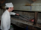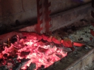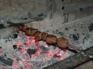 Перевертає шампур на інший бік щохвилини. Розмахує над м'ясом залізною лопаткою, щоб зменшився вогонь. Радить готувати, коли вогню зовсім немає. Баранину має гріти лише жар від вугілля.