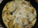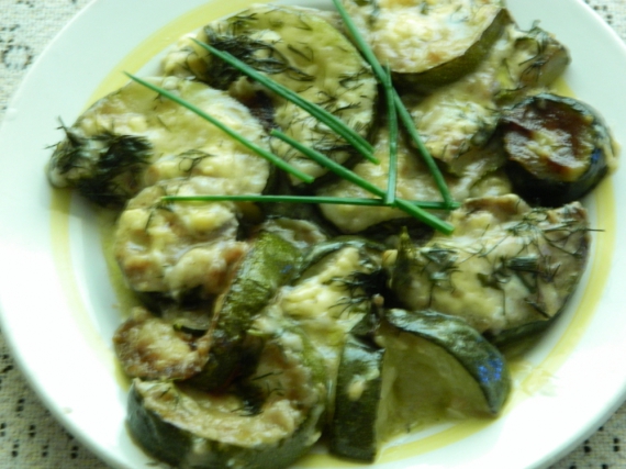 Посмажені кабачки Юля викладає у сковорідку. Кожен шар пересипає потертим голландським сиром. Насамкінець заливає кабачки соусом – для цього збиває 2 столові ложки сметани, 0,5 чайної ложки гірчиці, по 1 чайній ложці цукру та солі, кілька крапель соку лимона та дрібно порізані 4 зубці часнику.