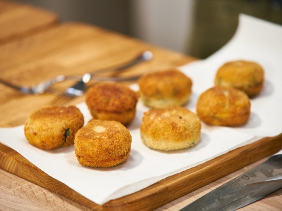 Пісні котлети з картоплі та шпинату шеф-кухар Андрій Полан мастить сирним кремом. Рецепт розповідає у програмі "Doradcа Smaku" ("Консультант по смаку").