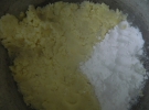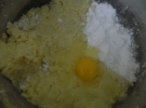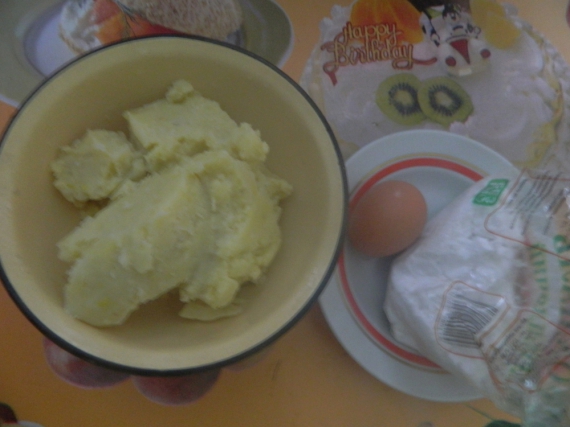 Картопляну масу вона розрівнює ложкою в каструлі. Потім ділить пюре ножем на чотири частини. Одну четвертину виймає. Порожній сегмент заповнює крохмалем. Потім усю картоплю, разом із вийнятою частиною, вимішує із крохмалем. Додає 1 яйце. Солить і перчить за смаком.