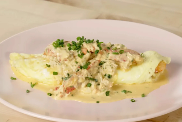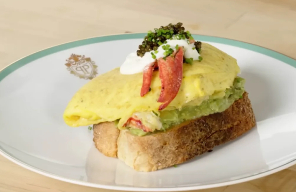 Шеф готельного ресторану готує розкішний французький омлет з використанням виключно преміальних інгредієнтів, що відповідає високому статусу закладу. Він використовує свіжі яйця вільного вигулу, кошерну сіль та свіжозмелений перець. Омлет готується на топленому маслі. Ключовий момент техніки - постійно рухати пательню, знімаючи її з вогню та повертаючи назад, щоб забезпечити ідеально рівномірне приготування без перегріву. Коли омлет майже готовий, додається розкішна начинка з вареного лобстера, заправленого базиліком та лимонним соусом. Для гостей у номерах омлет готується трохи менше, оскільки він продовжує "доходити" в гарячих боксах. Подається це кулінарне творіння з авокадо тостом на заквасці, прикрашається шматочком клешні лобстера, сметаною та