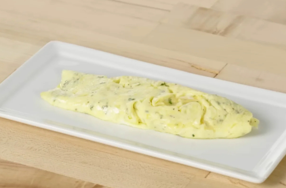 Французький шеф представляє класичний омлет у стилі бістро, який має бути вологим, ніжним і без підсмаженої скоринки. Він використовує лише дрібні французькі трави - петрушку, кервель і цибулю шніт, які надають тонкого аромату. Яйця делікатно збиваються виделкою, а не вінчиком, щоб уникнути зайвого повітря і зробити текстуру м'якшою та пухкішою. Омлет готується на дуже низькому вогні, використовуючи топлене масло, яке не горить. Яєчна маса обережно перемішується на пательні, а потім їй дають "схопитися", формуючи омлет в овальну форму. При бажанні готовий омлет можна змастити невеликою кількістю топленого масла для блиску.
