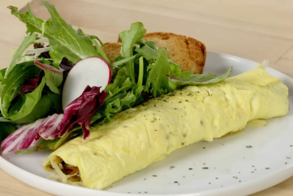 Шеф шкільної їдальні готує омлети для величезної кількості дітей щодня, тому тут важлива ефективність, безпека та відповідність стандартам харчування. Використовуються попередньо приготовані омлети зі шпинатом та сиром, що гарантує постійну якість та безпеку. Омлети розігріваються до необхідної температури. Готується домашня сальса з печених томатів та незвичайне піко де гайо з додаванням яблук. Ці фруктові компоненти додають кислинки та смаку, компенсуючи низький вміст солі та цукру, що важливо для дитячого харчування. Розігрітий омлет зі шпинатом та сиром викладається на цільнозернову тортилью.