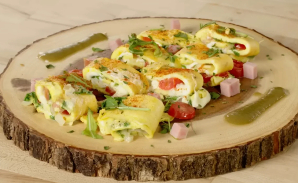 Модерністський шеф демонструє незвичайне поєднання - італійську інтерпретацію японського скрученого омлету (тамагоякі) зі смаками піци. До яєць додаються подрібнені анчоуси та спеціальна італійська суміш спецій. Як рідка основа використовується бульйон комбу та концентрован соус з томатів. Шеф ретельно лопає всі бульбашки повітря в яєчній суміші, щоб омлет вийшов щільним. Готується він шар за шаром: на маленьку пательню виливається тонкий шар, який після схоплення загортається, і на нього виливається наступний шар. Готовий багатошаровий омлет формується за допомогою бамбукового килимка для суші, а подається з оливковою олією, цедрою лимона та додатковою порцією "slice spice".