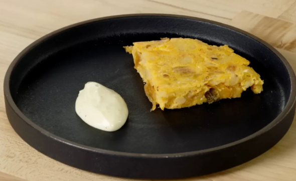 Шеф пропонує оригінальну іспанську тортилью з несподіваним азіатським акцентом - кімчі. Основа страви - попередньо відварена картопля та цибуля, до яких додається смажене кімчі для пікантності та складності смаку. До збитих яєць обережно додається (темперується) гаряча суміш картоплі та кімчі, щоб яйця не зварилися завчасно. Цій суміші дають трохи постояти. Потім вона виливається на розігріту з олією пательню. Ключова особливість іспанської тортильї - вона має залишатися рідкуватою і тягучою всередині. Після приготування нижньої частини, омлет швидко перевертається і повертається на пательню, щоб доготуватись. Краї формуються лопаткою, і подається тортилья з айолі.