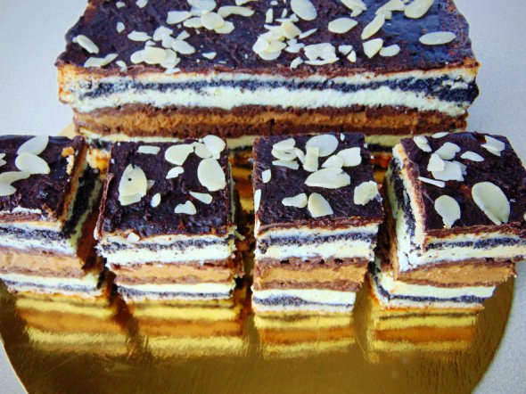У форму викласти шарами: частину світлого тіста, половину макової маси й половину сирної. Наверх натерти на грубій тертці частину темного примороженого тіста. Випікати 40 хв. за температури +180°С. Повторити весь процес із другим коржем.