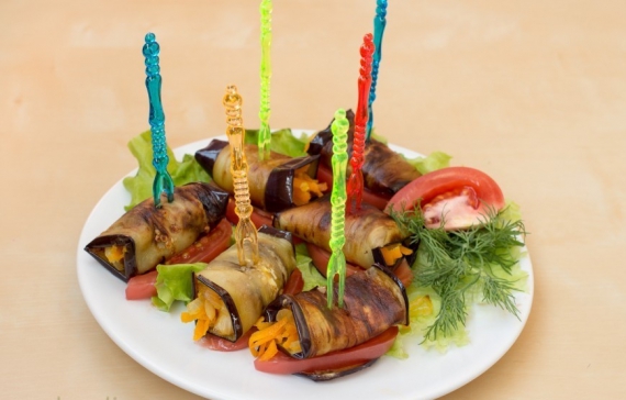 Нарізує півкільцями 1 свіжий помідор. Загортає смажену цибулю і моркву в баклажани. Знизу рулету кладе по шматку помідора, закріплює кожен рулет шпажкою.