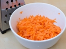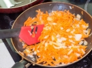 "Тим часом готую начинку для баклажанів. Дрібно ріжу 1 цибулину. Натираю на тертушці 1 велику морквину. Кладу на розігріту сковорідку із олією спочатку моркву, просмажую її кілька хвилин. Солю її, кладу також чорний мелений перець на кінчику ножа. Потім кладу туди ж цибулю, зменшую вогонь і смажу іще протягом 7 хвилин, прибираю із вогню."