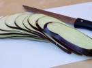 Для 14 рулетів закуски ріже тонкими рівними пластинами 2 свіжих баклажани. Солить їх із обох сторін і лишає полежати на тарілці 20 хвилин, щоб увібрали сіль і стали м'якшими.