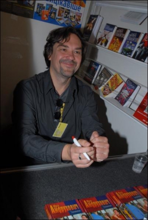 — Нічого собі, як Андрухович вирядився, — сміється якась дівчина. — Тю, так то не він був, — розчаровано додає за хвилину, коли на сцену виходить письменник. Одягнений у сині джинси та футболку з надписом "Курва, радіо, телебачення, курва, преса". Це цитата з його вірша.