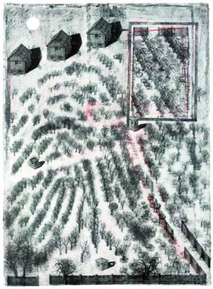 Офорт із серії ”Втрачений рай” цьогорічного лауреата Шевченківської премії Павла Макова. Художник намалював плани дачного містечка на Муромському водосховищі під Харковом, за 15 кілометрів від кордону з Росією. Живе в ньому понад 10 років