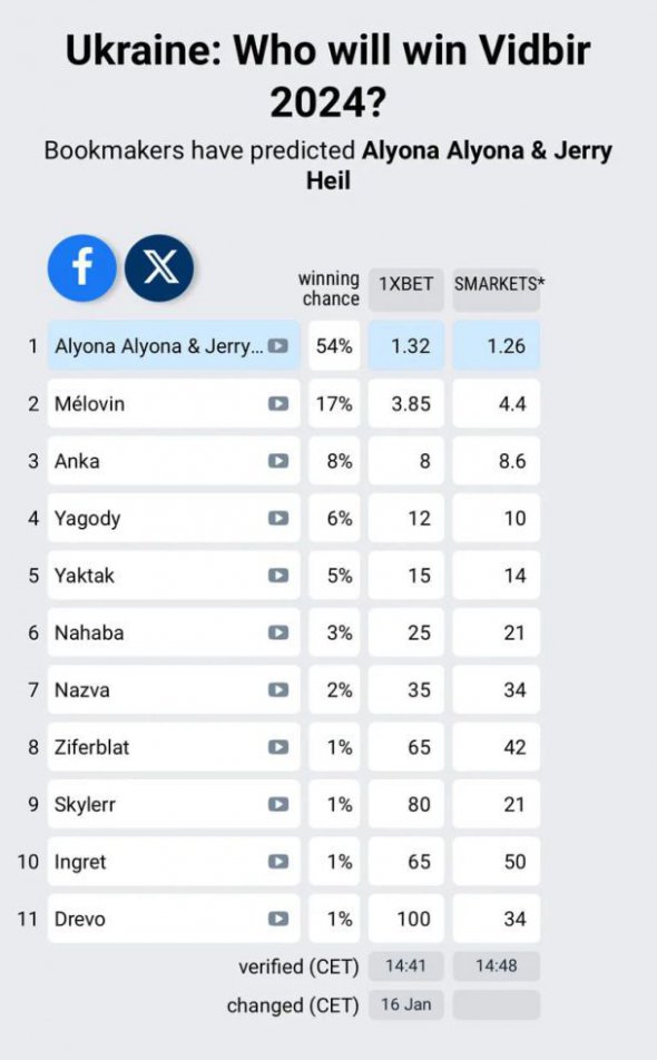 Букмекери оцінили шанси на перемогу 11 фіналістів Національного відбору "Євробачення 2024".
