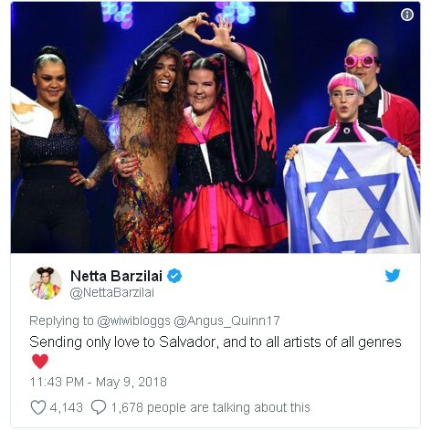 "Надсилаю лише мою любов Собралу і всім артистам усіх жанрів", - написала ізраїльтянка у Twitter та виклала своє фото з представницею Кіпру Елені Фурейрою.