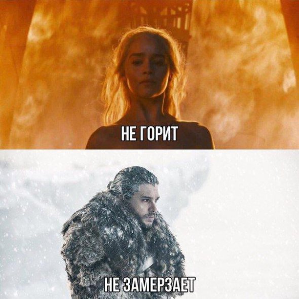 Картинка з Дейнеріс і Джоном, натякає на назву роману "Пісня льоду і полум'я": "Не горить - не замерзає".