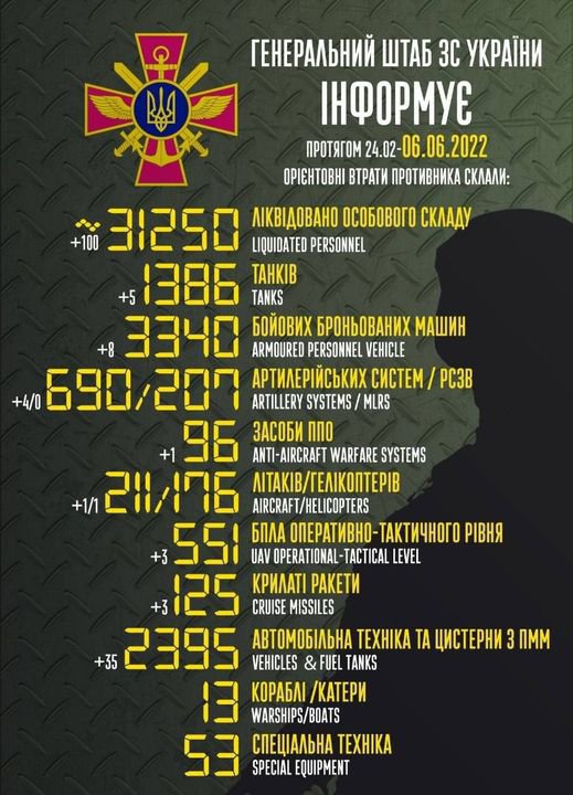 Втрати російських окупантів в Україні 6 червня становлять 31 250 осіб.