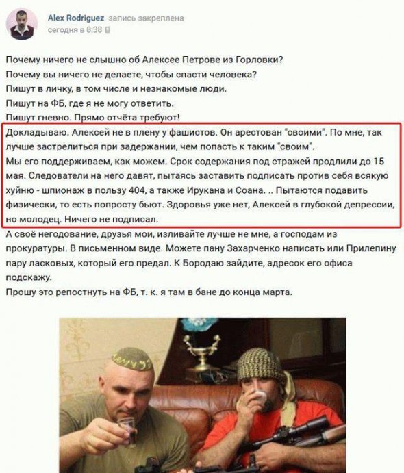 "Олексій не в полоні у "фашистів". Його заарештували "свої". Краще застрелитися під час затримання, ніж потрапити до таких своїх. Намагаються придушити фізично, тобто просто б'ють. Здоров'я вже немає, Олексій в глибокій депресії", - написав Родрігез.