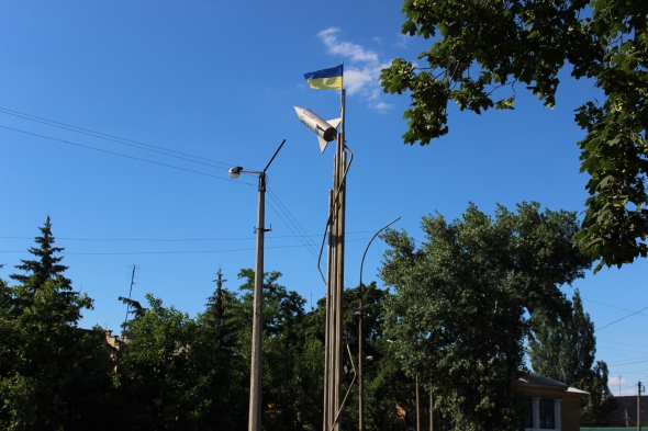Обабіч дороги - стовп із моделлю ракети. На ній написано "Волю Надії". Таку акцію провели місцеві активісти на день народження Надії Савченко.