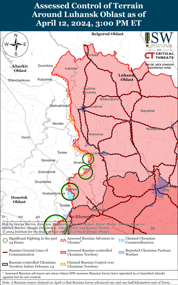 Під Часовим Яром тривали позиційні бої, однак підтверджених змін лінії фронту немає, повідомляють в Інституті.