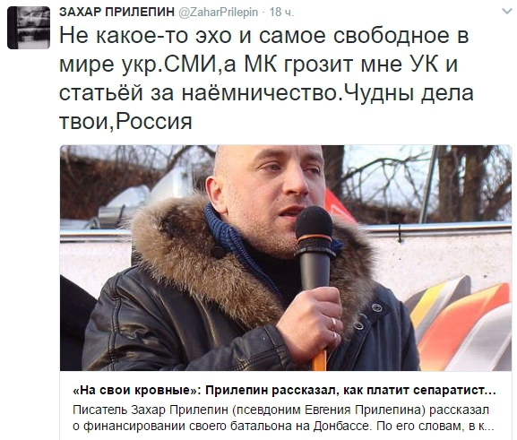 "Не якесь "Эхо" чи найвільніші у світі укрЗМІ, а "Московський Комсомолець" погрожує мені карним кодексом і статтею за найманство. Дивні справи твої, Росіє", - так Захар Прилєпін прокоментував звинувачення журналістів.