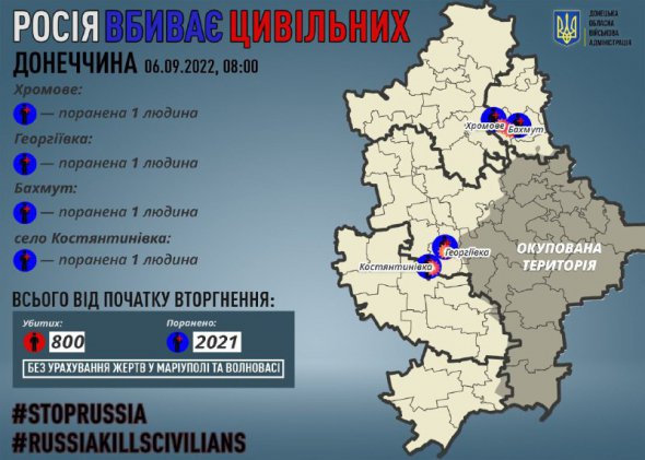 Від початку повномасштабного вторгнення терористи вбили щонайменше 800 мешканців Донеччини, ще 2021 особа зазнала поранень від рук загарбників.