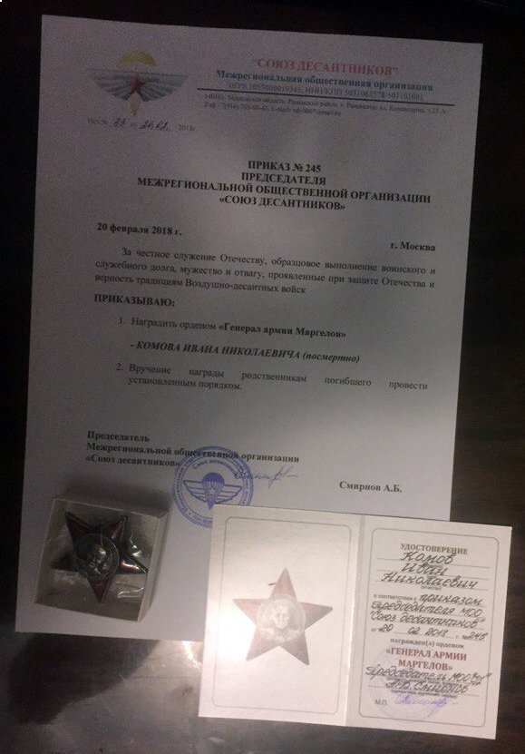 Російська організація "Союз десантників" посмертно нагородила військового Івана Комова з Краснодарського краю, який загинув на Донбасі в 2014 році.