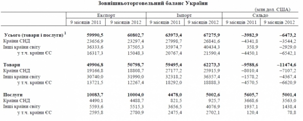 Дефіцит зовнішньоторговельного балансу України за 9 місяців 2012 року становив $6 млрд 473,2 млн.