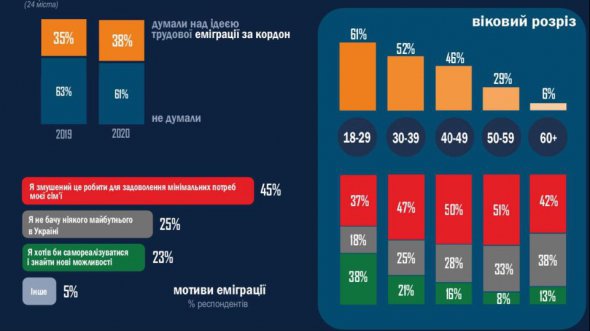 Нещодавно соціологічна група "Рейтинг" провела опитування 19 400 людей в 24 містах. 61% молоді від 18 до 29 років думають про те, щоб поїхати на заробітки за кордон. У віці від 39 до 49 років кожен другий хоче поїхати заробляти за кордоном. 45% всіх опитаних на запитання: "Чому ви хочете поїхати за кордон?" відповіли, що не мають достатньо грошей на нормальний рівень життя.